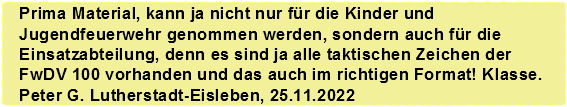 Lassen Sie die Kinder und Jugendlichen machen: Piktogramme bestimmen und ihren Beschreibungen zuordnen lassen, absichtliche Fehler einbauen und finden lassen, Einsätze darstellen, Gefahren der Einsatzstelle bestimmen, PSA zusammenpuzzeln und und und... der Phantasie sind keine Grenzen gesetzt.